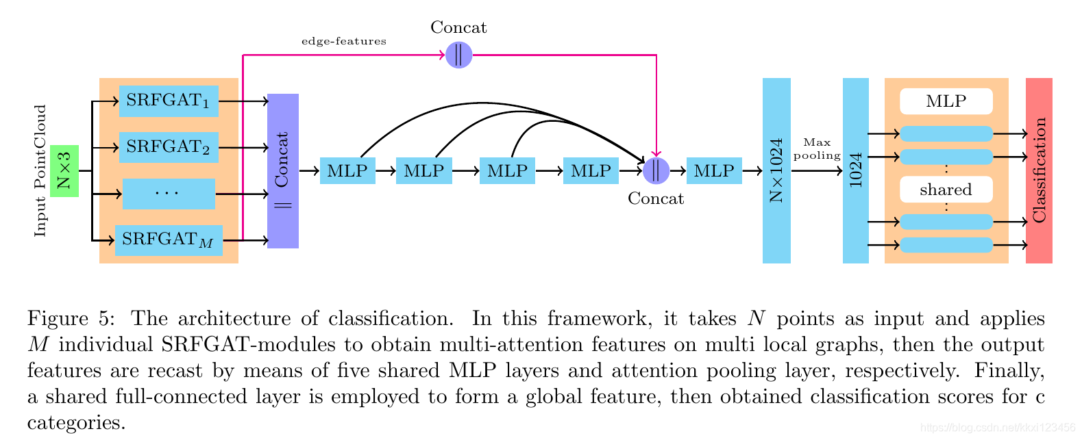 \caption{The architecture of classification. In this framework, it takes $N$ points as input and applies $M$ individual SRFGAT-modules to obtain multi-attention features on multi local graphs, then the output features are recast by means of five shared MLP layers and attention pooling layer, respectively. Finally, a shared full-connected layer is employed to form a global feature, then obtained classification scores for c categories.}