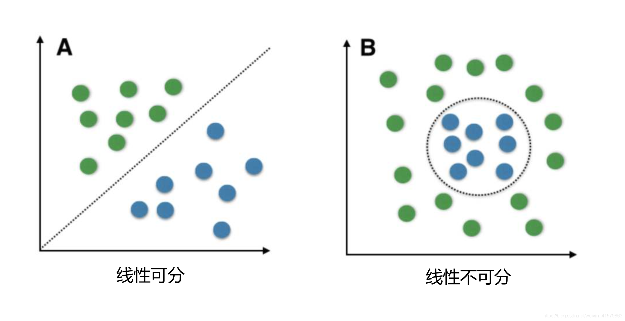 通常情况下一个分类问题可以分成线性可分和线性不可分两种,下面是它们的图像表示: