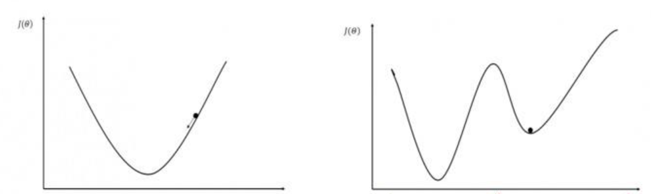 左面是凸函数,有全局最优点,右边是非凸函数,有全局最优点和局部最优点,如果是非凸函数,求得的解有可能不是最优解(即局部最优解)。