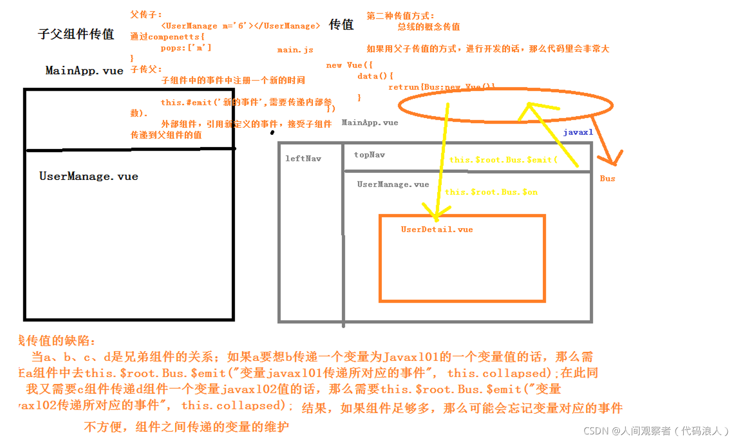 通过数据总数Bus,this.$root.$emit('事件名',参数1,参数2,...)
