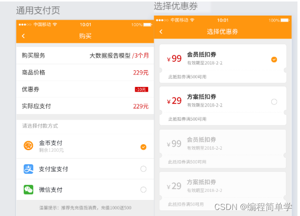 支付页显示可用优惠券的数量,点击后跳转到选择优惠券页面,选择好优惠券后跳转到支付页。优惠券按照优惠额度排序。