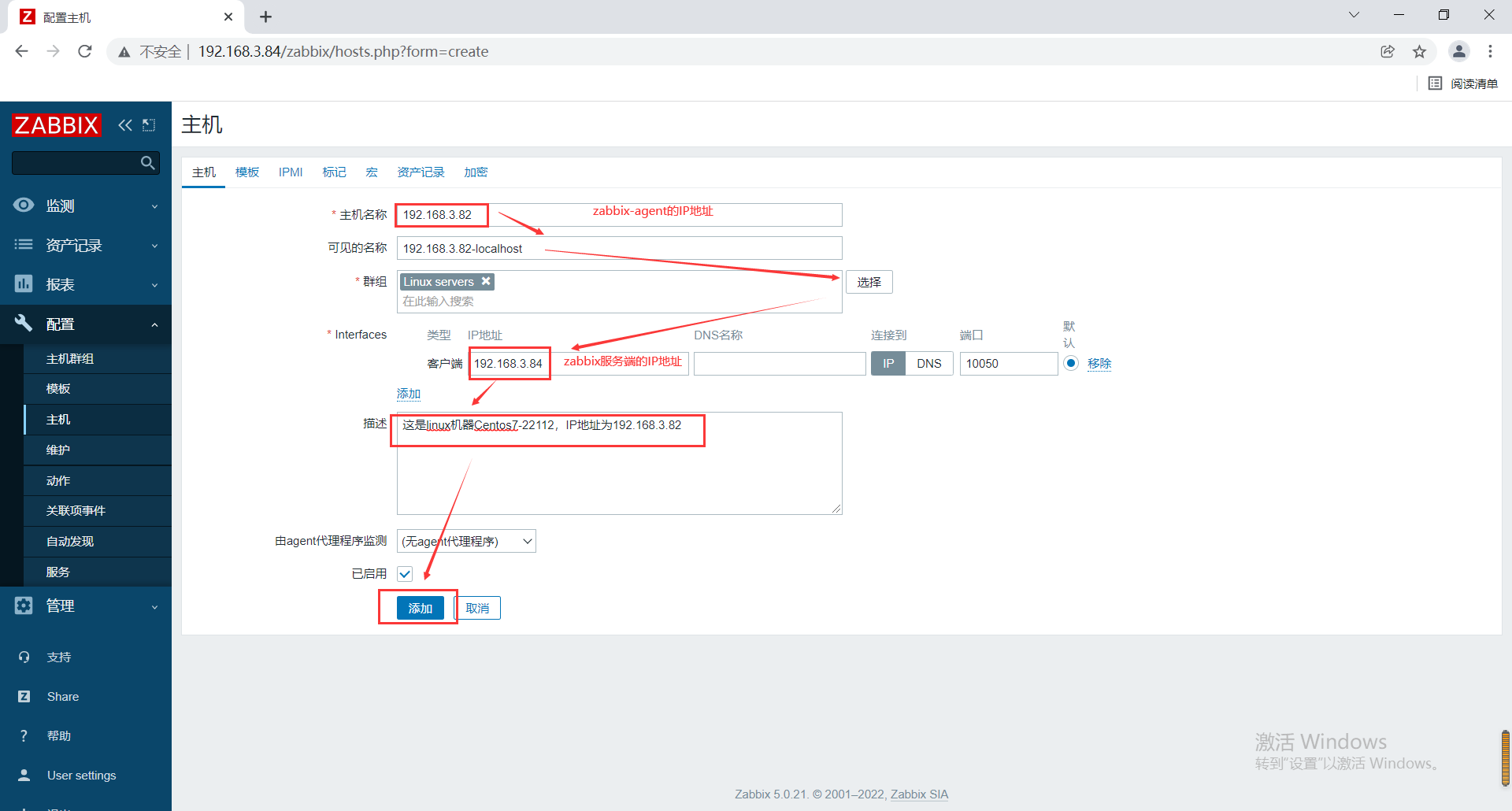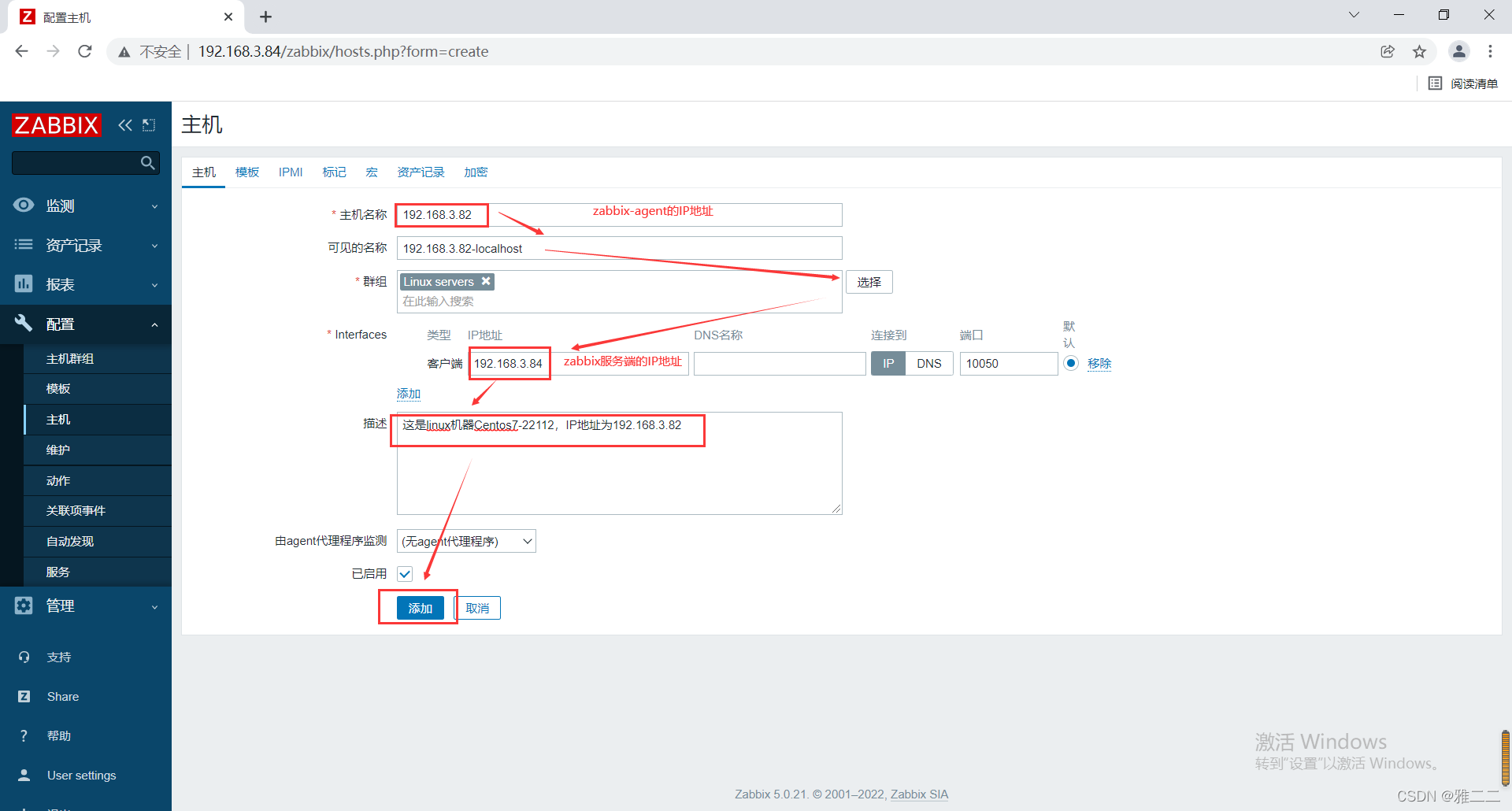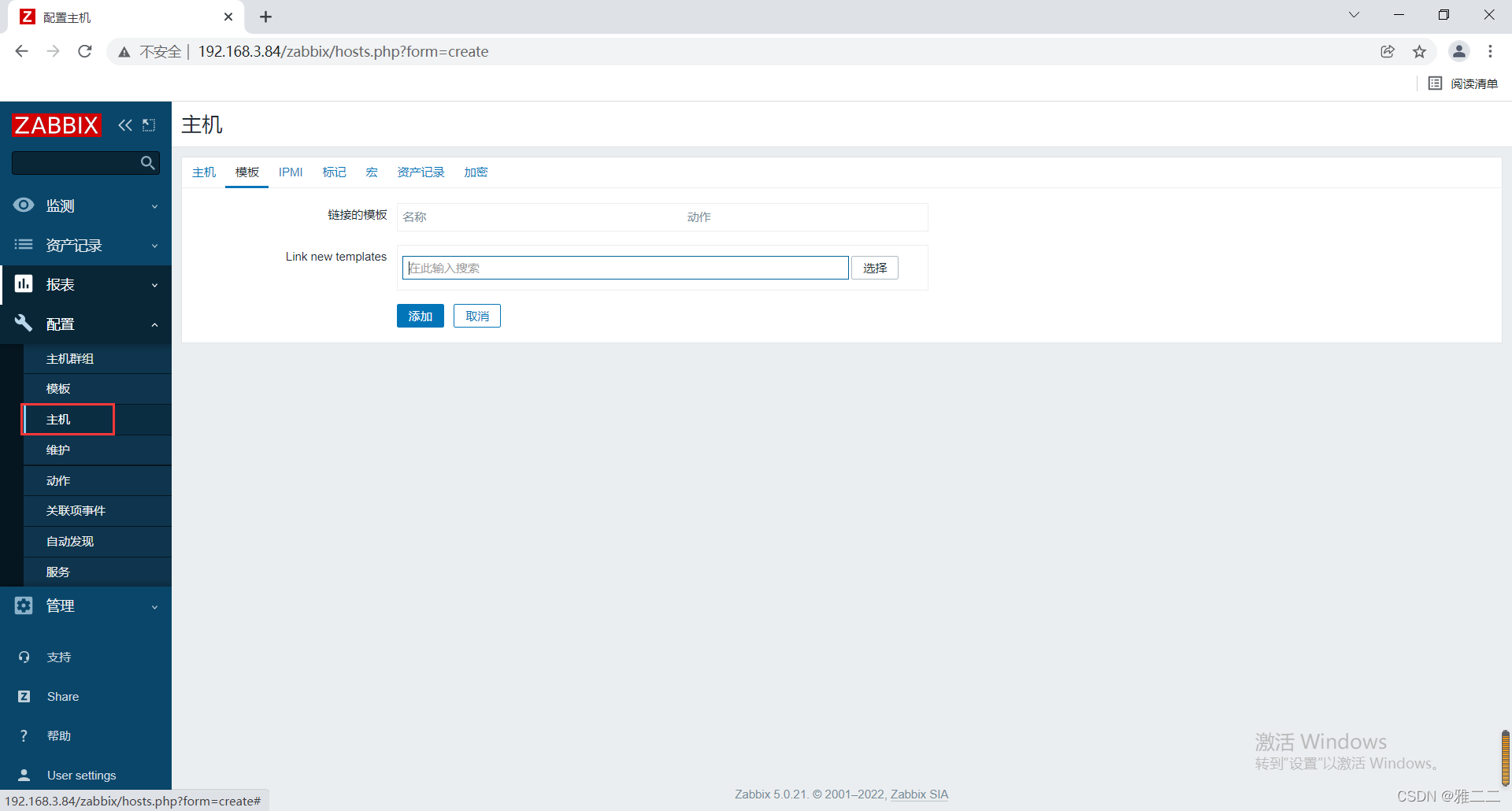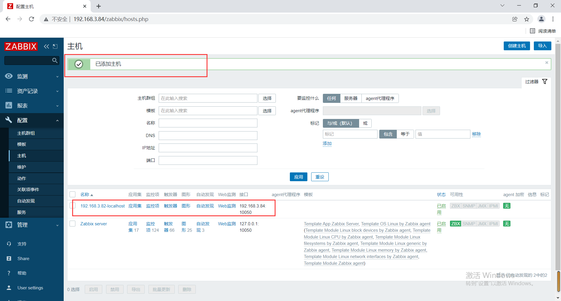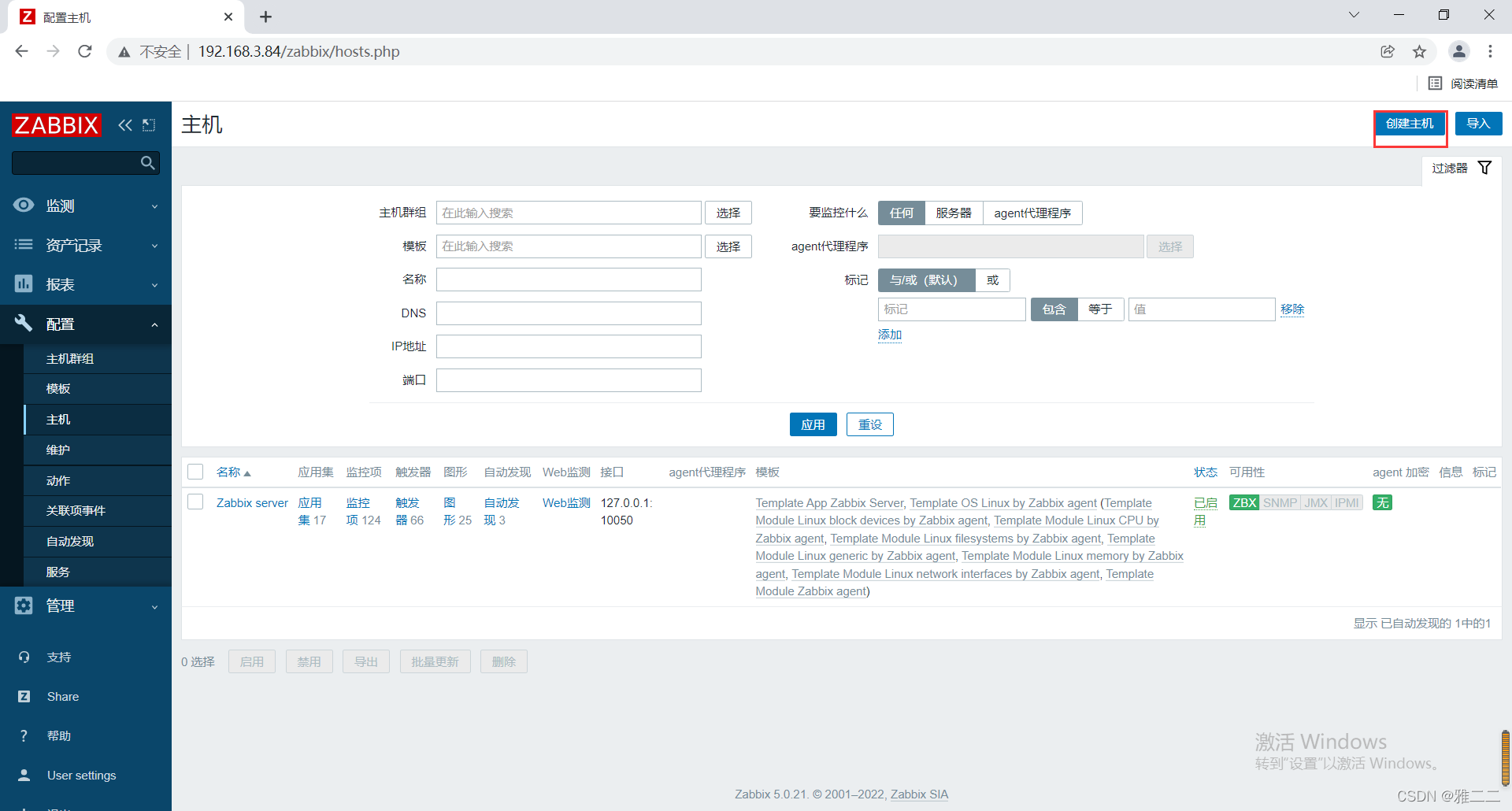 1.点击“配置”中的“主机”——“创建主机”