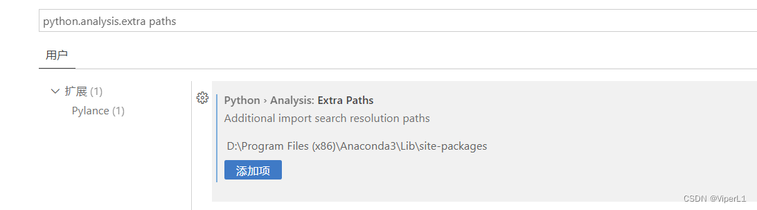 在设置界面中找到python.analysis.extra paths,将Anacoda的扩展库路径添加进去(一般是安装路径下的/Lib/site-package)