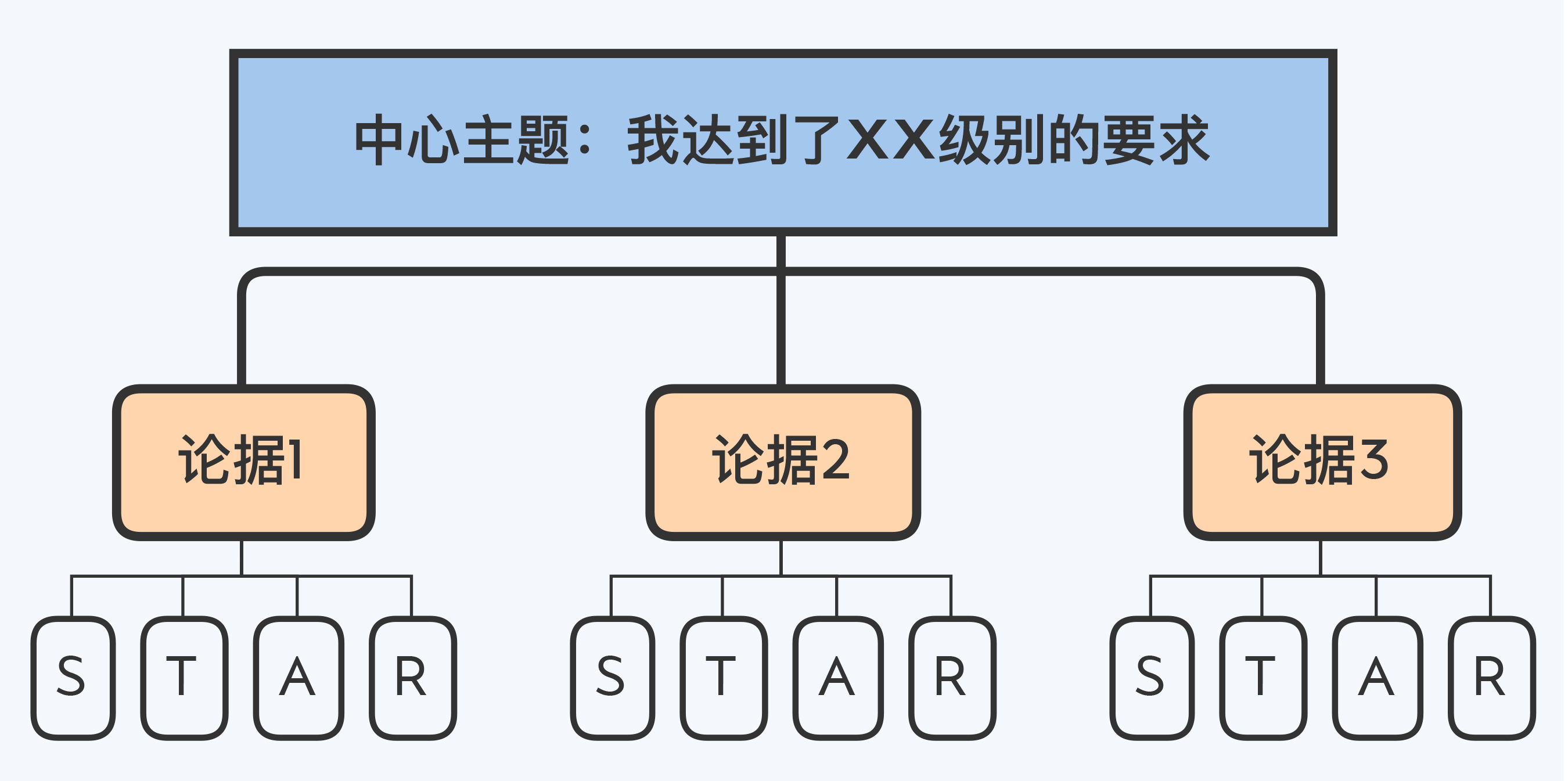 自述材料总体的写作指导思想就是金字塔原理,围绕“我达到了 xx 级别的要求”这 1 个中心主题,设计 3~5 个核心论据,每个论据分为背景、任务、行动和结果 4 个部分展开。整个结构就像金字塔一样,中心明确,层次分明,逻辑清晰。