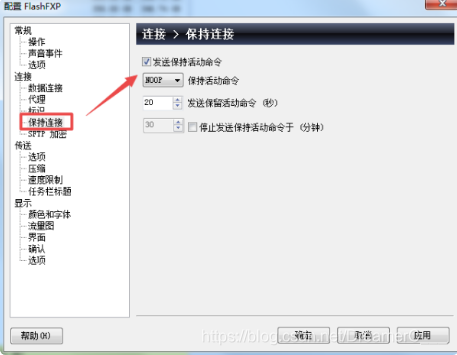 这时可以通过设置FlashFXP让其在空闲时自动向服务器发送指令来保持连接:单击菜单“选项→参数设置”,然后在打开的窗口中选择“连接-保持连接“选项卡,然后勾选“发送保持活动命令”选项并选择下拉列表中的“NOOP”(循环),再将后面的时间值设置小些(例如20秒)即可。如图: