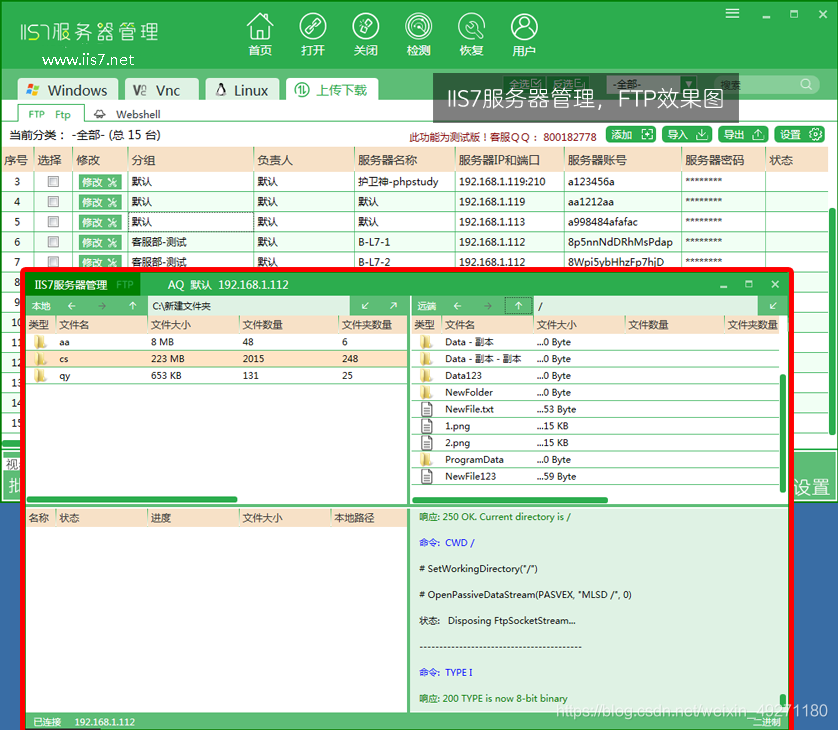 IIS7服务器管理工具中的ftp功能可以实现批量添加服务器信息,定时任务 (定时上传、定时下载),自动更新功能,大量文件快速加载,边加载边传输,批量连接一键关闭等。