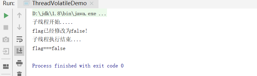 }运行结果如下,当变量没被volatile修饰时,主线程修改共享变量的值后并没有更新到主内存中,所以另一个线程无法读取到修改后的值导致出现死循环。