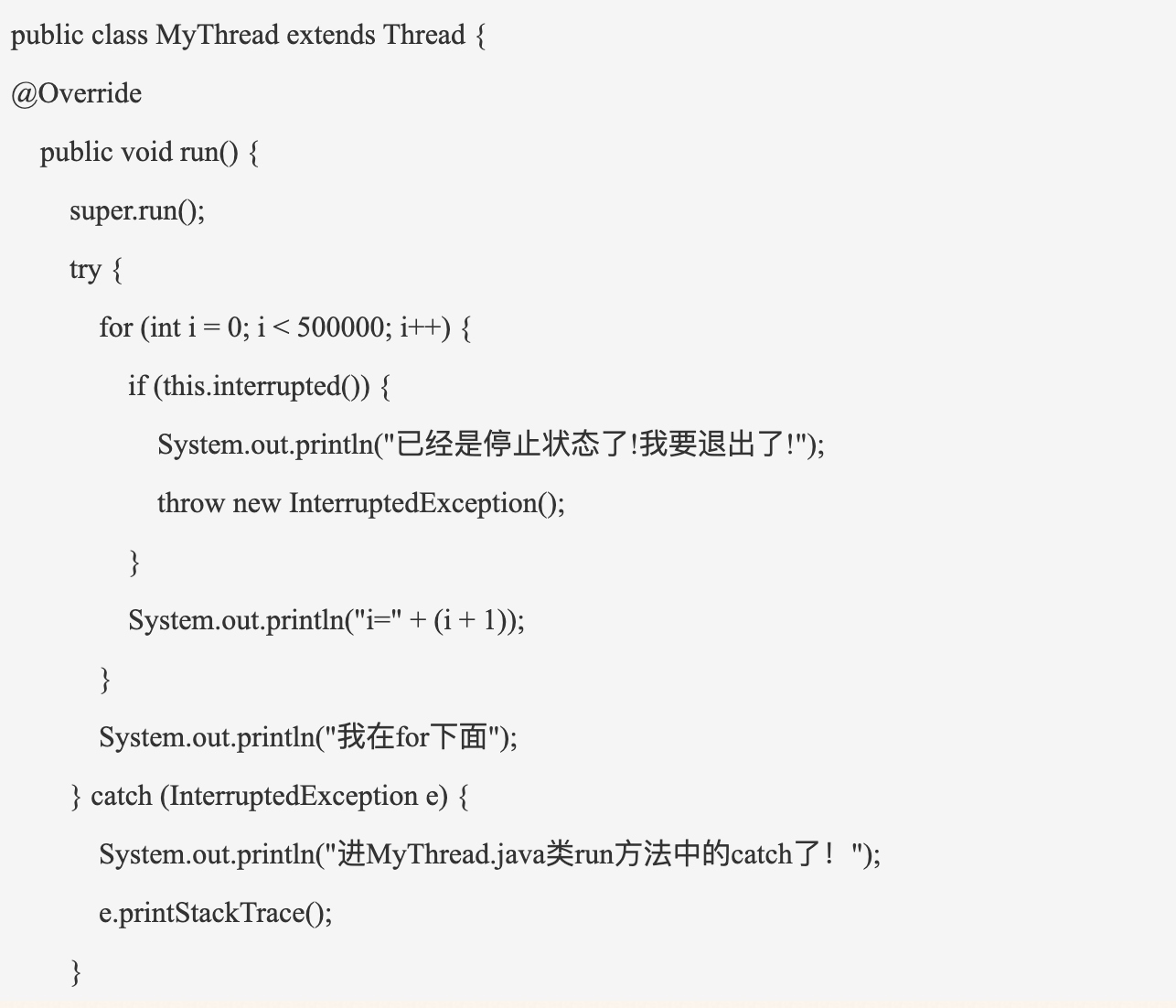 使用interrupt()方法并不能立即终止我们的线程,它只会将该线程标记位中断状态,当线程内的任务执行完之后,才会真正地终止。如果我们想要立即终止该线程的话,需要在run()方法中去判断线程是否被终止,来主动终止该线程。