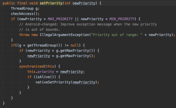 线程可以划分等级,优先级高的线程获取的CPU资源更多,也就是让优先级高的线程获取更多的CPU时间片。线程设置优先级的源码如下:setPriority()。
