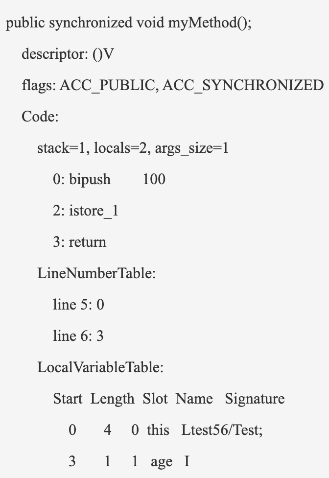在字节码指令中,我们的同步方法使用了ACC_SYNCHRONIZED标记flag来标记该方法为同步方法,当我们线程访问该方法的时候,就需要获取该方法所在对象的锁,才能进入。