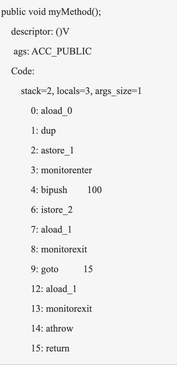 在字节码指令中,我们的同步代码块,使用了monitorenter和 moniterexit指令来进行同步处理。