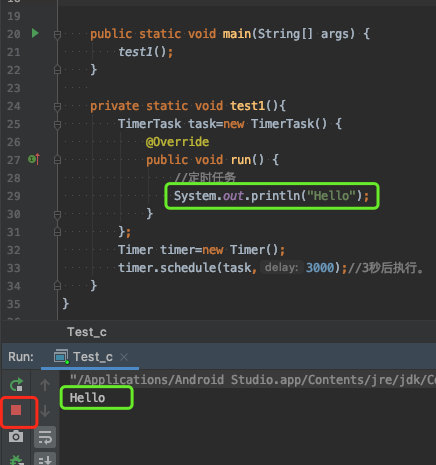 如下图:当我们在3秒后执行了输出“Hello”的操作之后,我们的程序并没有停止。而是一直处于运行状态。原因继续往下看。