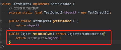 要想解决该问题,就需要使用如下的readResolve方法,在我们反序列化之后,返回原来的静态对象。