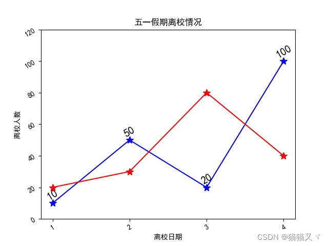 plt.plot([1, 2, 3, 4], [20, 30, 80, 40], "r", marker='*', ms=10)这样我们就可以得到这样的两组数据图: