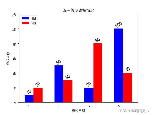 plt.text(a, b + 1, str(b), ha='center', va='bottom', fontsize=15, rotation=30)当多组数据的时候是不是有些混乱不知道这些数据是哪一组?这个时候我们就需要图例: