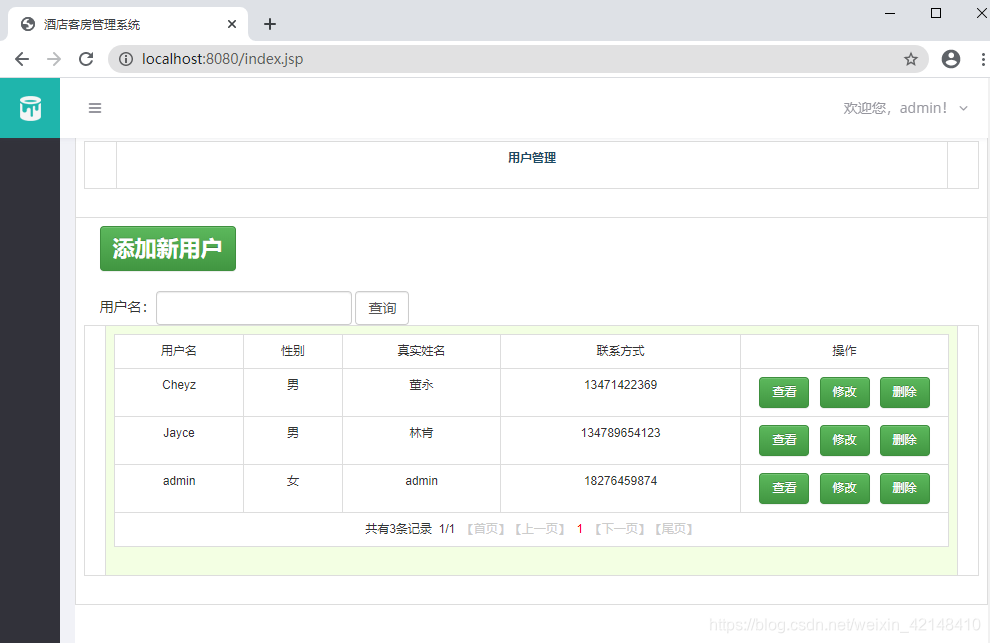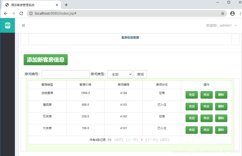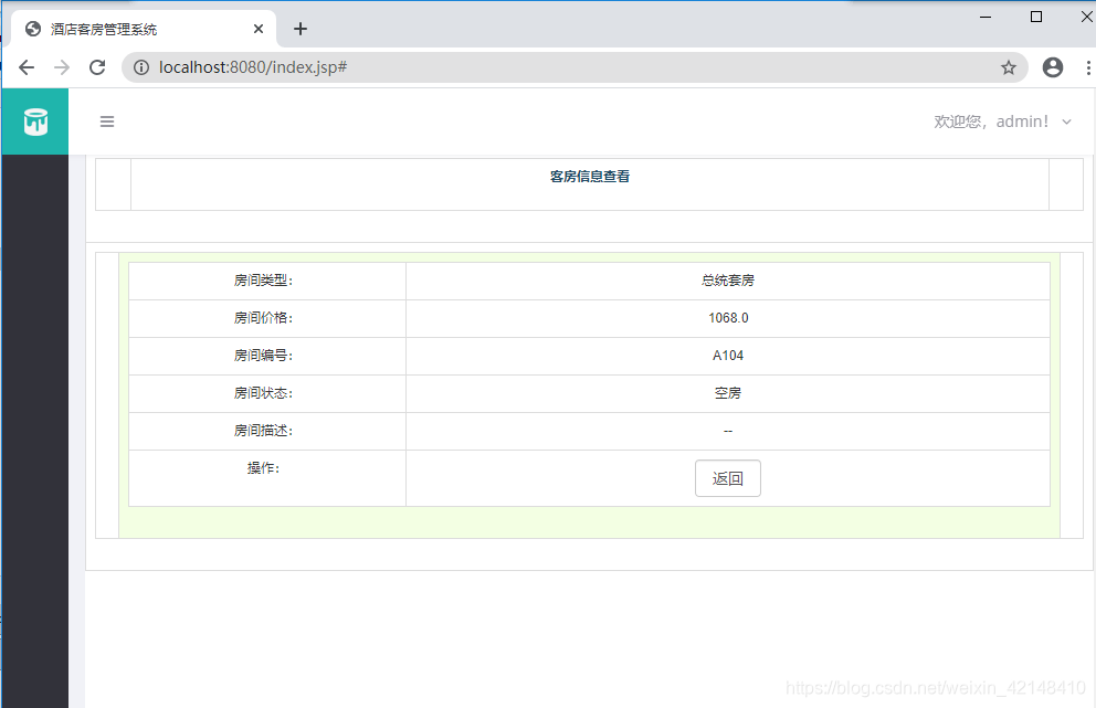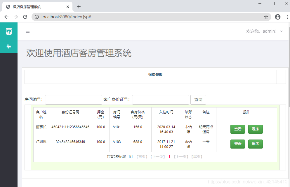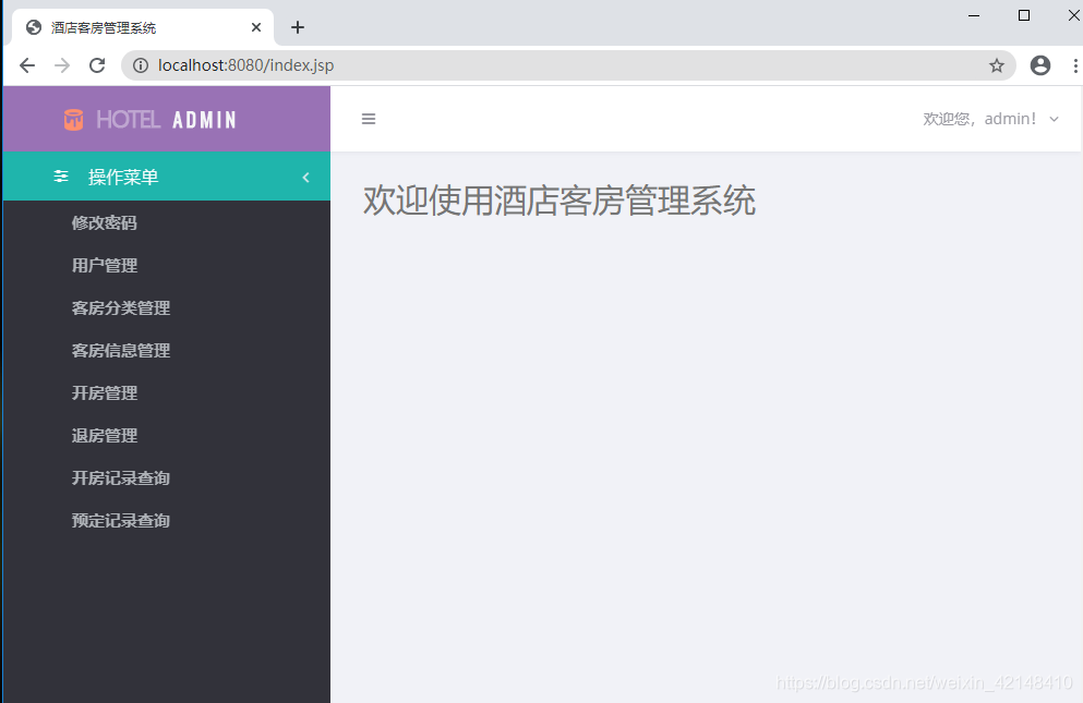 本系统是分两个角色登录的,一是管理员,二是用户。管理员可以对客房进行最大权限的操作,比如入住、退房、管理用户等等。好,介绍就到这里,如果想学习请到CSDN下载源码,当然关注我也可以下载。