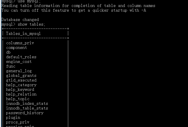 可以看到,我们的数据库都列了出来,然后使用MySQL的; 命令进入的MySQL的这个数据库(是不是很绕口,哈哈哈,这里的MySQL的的数据库是指的这一个数据库,好吧我可能还是没说明白)