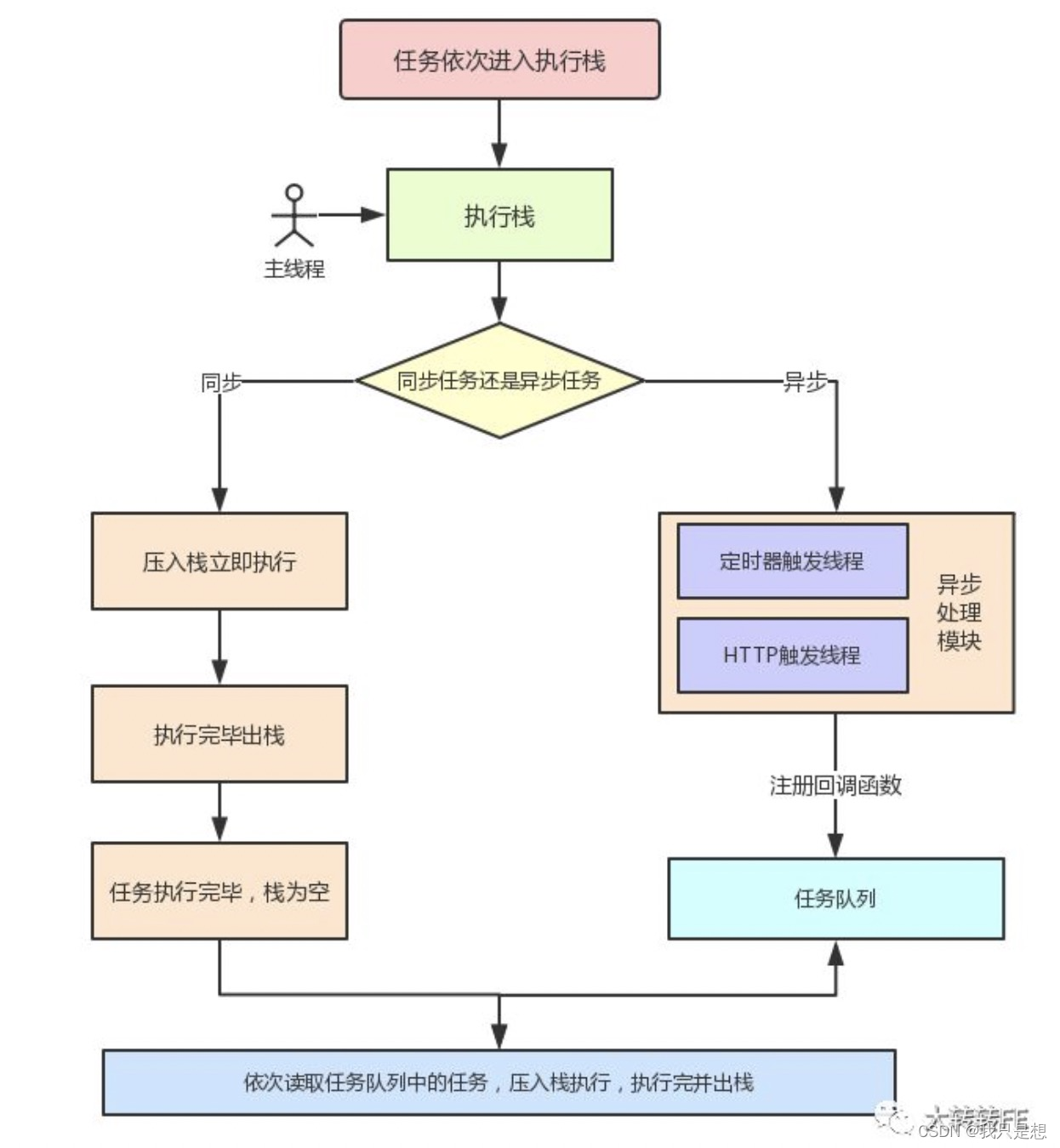script开始,任务依次进入栈中,被主线程执行,执行完后出栈。 - 遇到异步任务,交给异步处理模块处理,对应的异步处理线程处理异步任务需要的操作,例如定时器的计数和异步请求监听状态的变更。