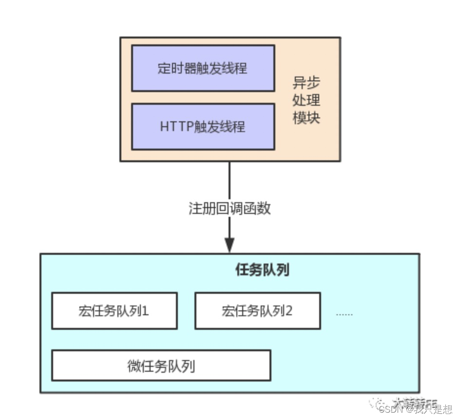 - 异步任务完成注册后会将回调函数加入任务队列等待主线程执行。