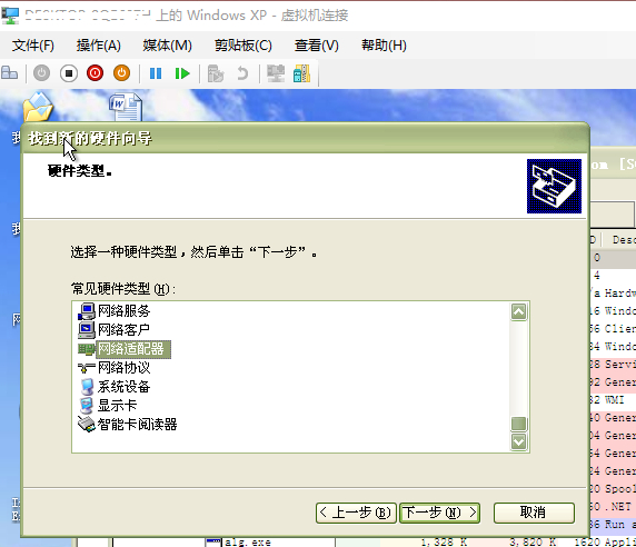 硬件类型选择网络适配器, 厂商选intel, 再选择21140这个网卡即可。