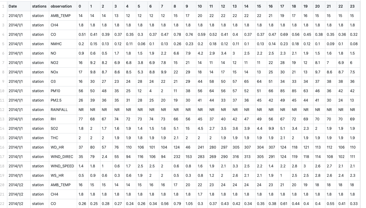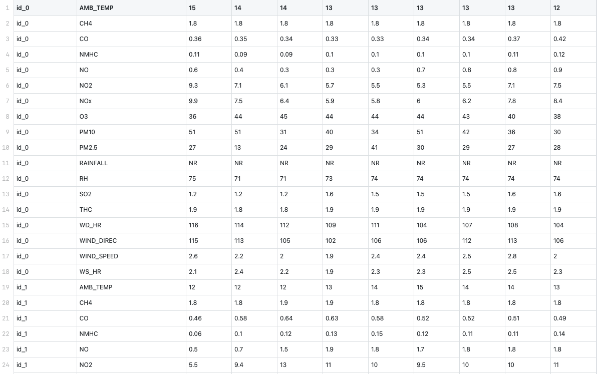 大概的内容是数据集中记录了12个月的前20天每天24个小时的18个物质浓度的资料,然后测试集就是剩余的数据中再取的。从上述我们可以得到以下结论: