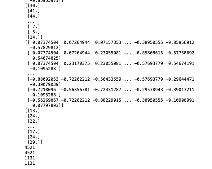 上述所有工作做完之后,X就是包含所有数据的数组,Y就是所有数据的结果,但此时还不可以进行训练,还需要两个步骤才可以。