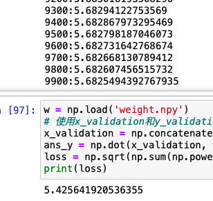 loss = np.sqrt(np.sum(np.power(np.dot(x, w) - y, 2)) / 471 / 12)