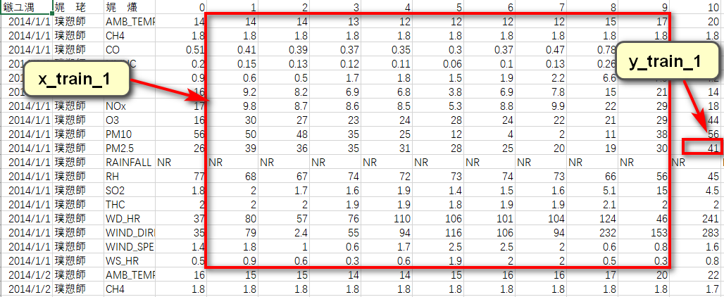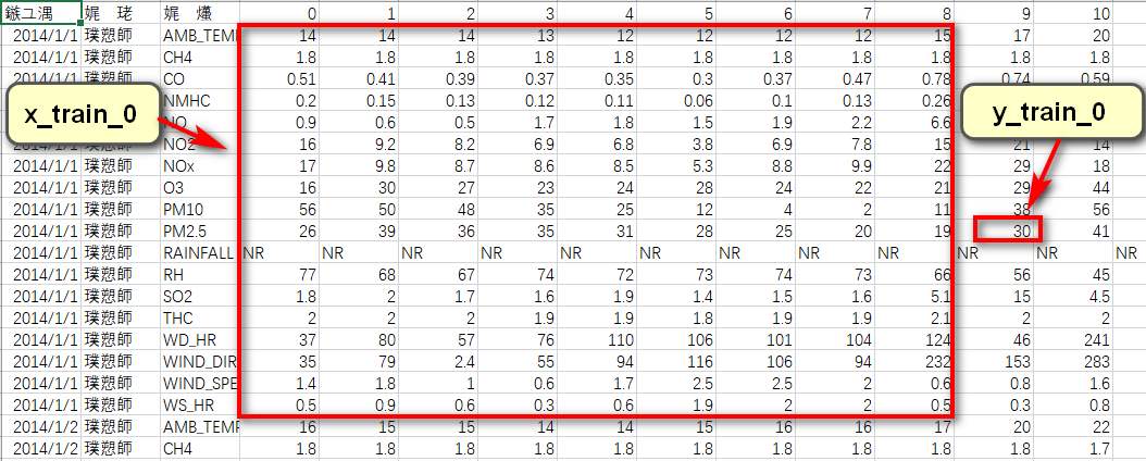 x[month * 471 + day * 24 + hour, :] = month_data[month][:, day * 24 + hour: day * 24 + hour + 9].reshape(1, -1)