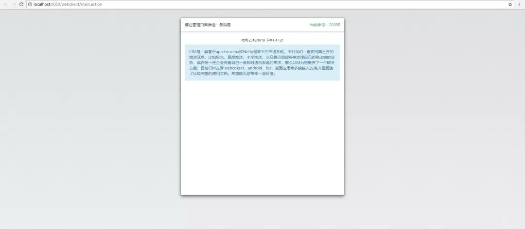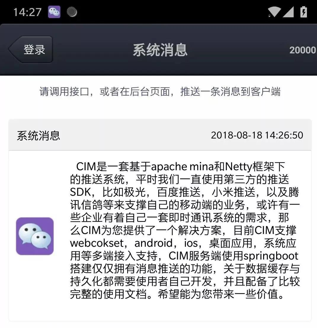 该项目是一套基于mina或netty框架下的推送系统,或许有一些企业有着自己一套即时通讯系统的需求,那么CIM为您提供了一个解决方案,目前CIM支持websocket,android,ios,桌面应用,系统应用等多端接入支持,可应用于移动应用,物联网,智能家居,嵌入式开发,桌面应用,WEB应用以及后台系统之间的即时消服务。
