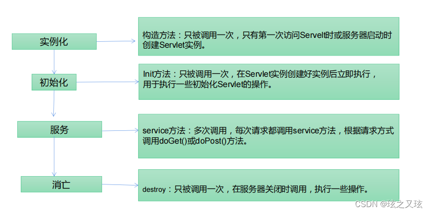 销毁阶段: 当服务器关闭,servlet在真正的销毁之前,服务器会调用destroy(),掉用的是已经生成的servlet对象的destory()方法执行一些最终的操作