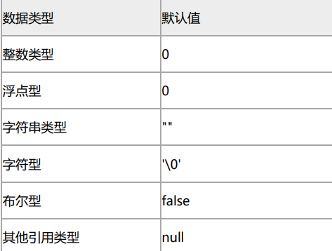 字段在类中定义完成后,在类加载时,会自动为字段赋值,不同数据类型的字段默认值不同, 如下表所示。