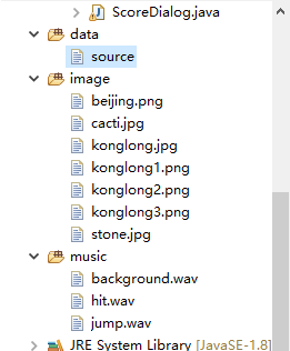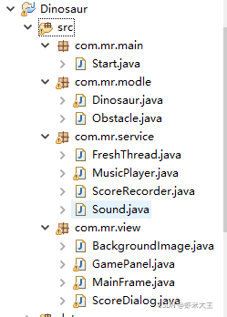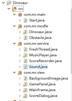 代码文件分别是Start.java,Dinosaur.java,Obstacle.java,FreshThread.java,MusicPlayer.java,ScoreRecorder.java,sound.java,BackgroundImage.java,GamePanel.java,MainFrame.java,ScoreDialog.java。