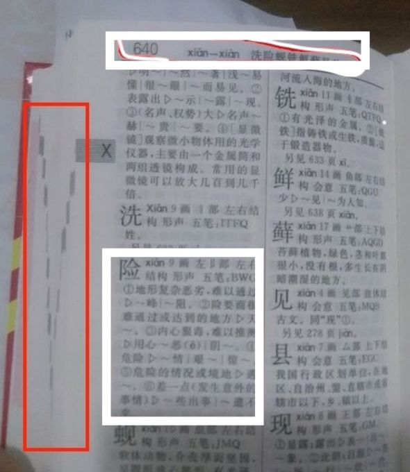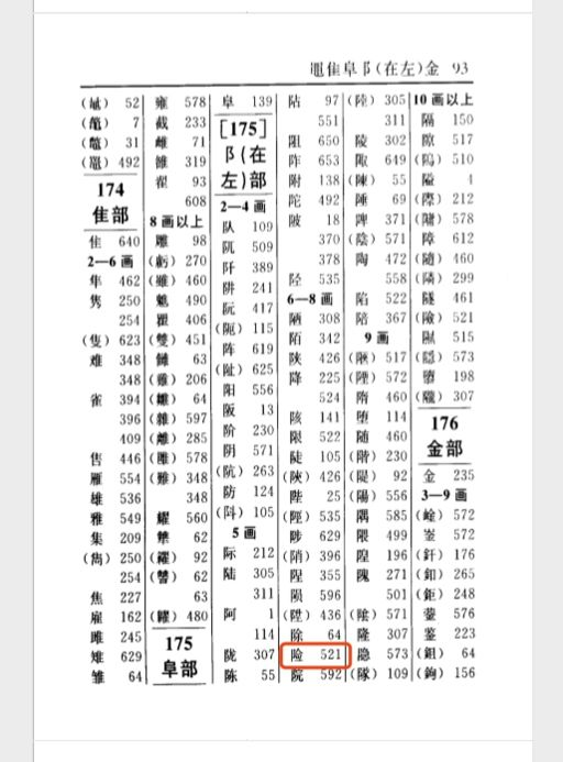 找到部首后,右边的页码还不是 险字真正的页码,我们还需要根据右边的页码找到对应部首在检字表中的位置。找到第93页的检字表后我们就可以根据 险字余下的笔画数(7画)在“6-8画”这一部分里找到 险字真正的页码了。