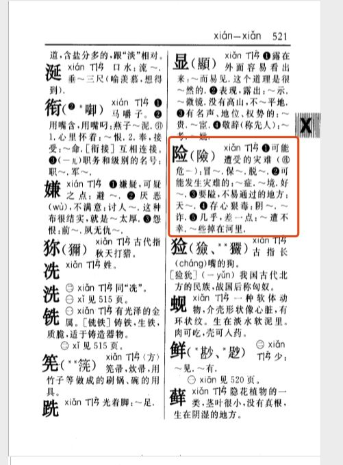 新华字典里还有一种目录被称为“部首目录”,下面可以看到,要使用这个目录我们首先会根据部首的笔画数找到对应该能的部分,然后可以在里面找到我们想找的部首。比如如果我们还是要找 险字所在的位置: