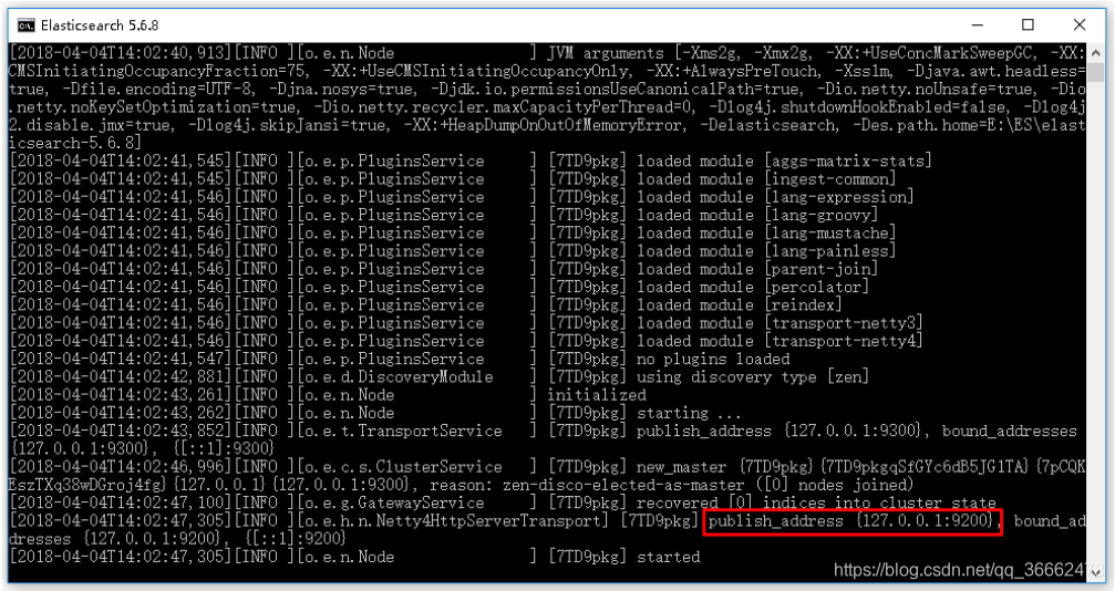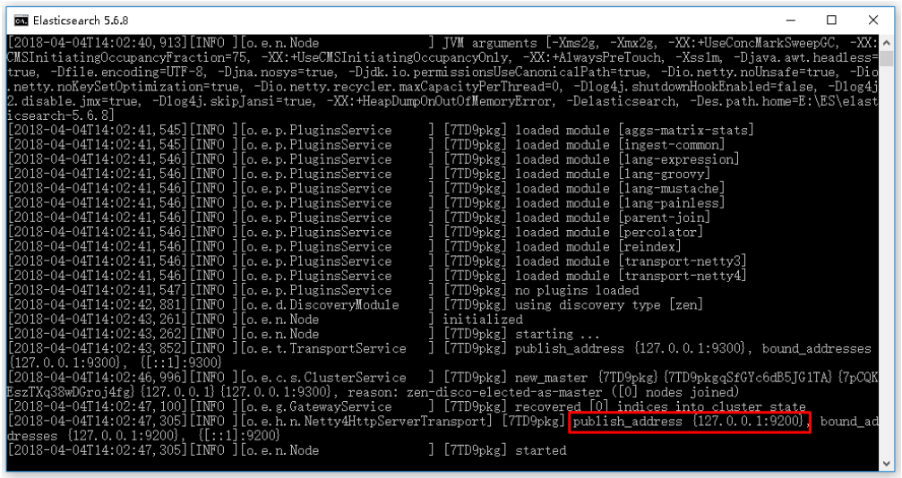 点击ElasticSearch下的bin目录下的elasticsearch.bat启动,控制台显示的日志信息如下: