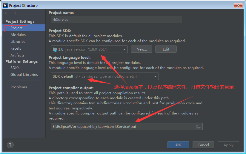 第二步:选择Java版本,以及程序编译文件、打包文件输出的目录;