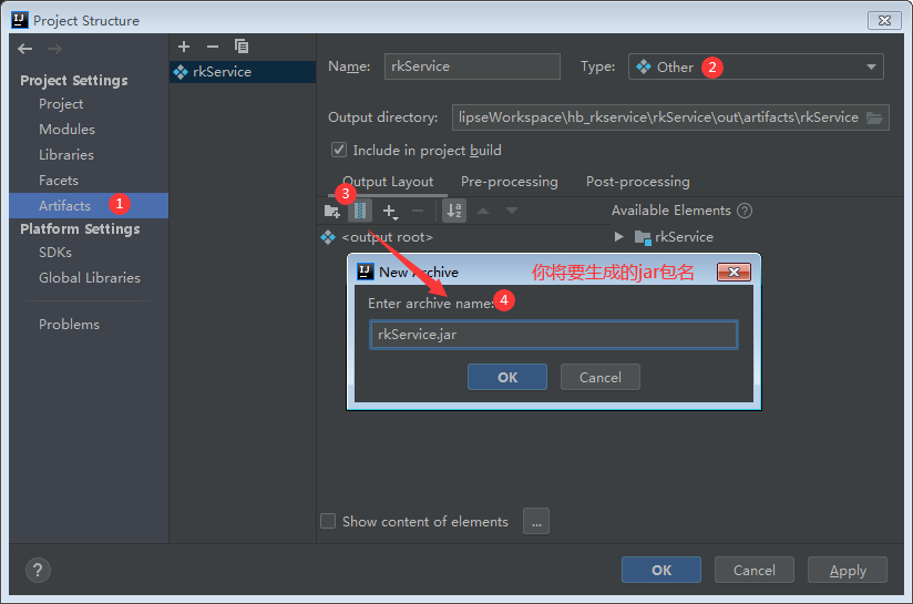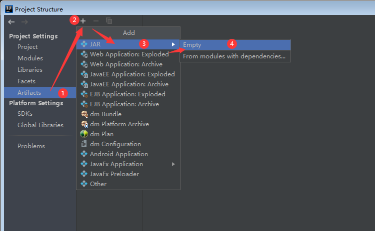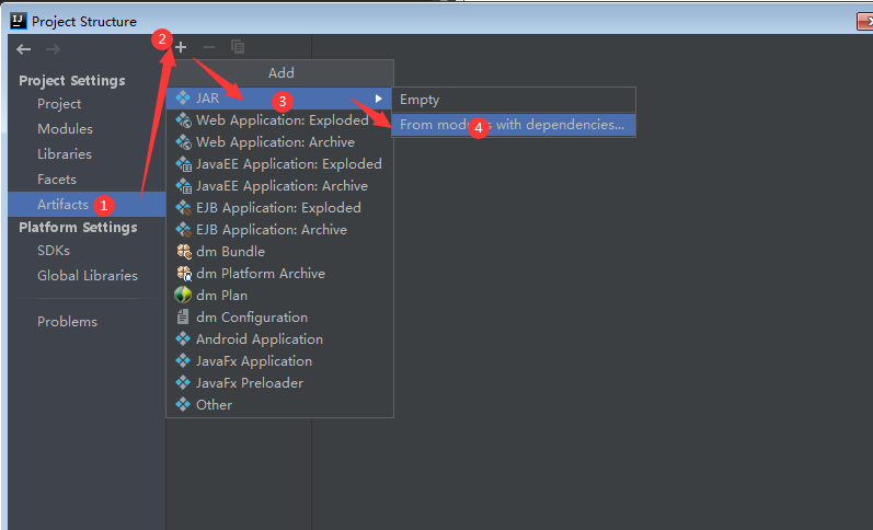第三步:选择Artifacts,点击“+”,在Add中选择JAR,如下图步骤;
