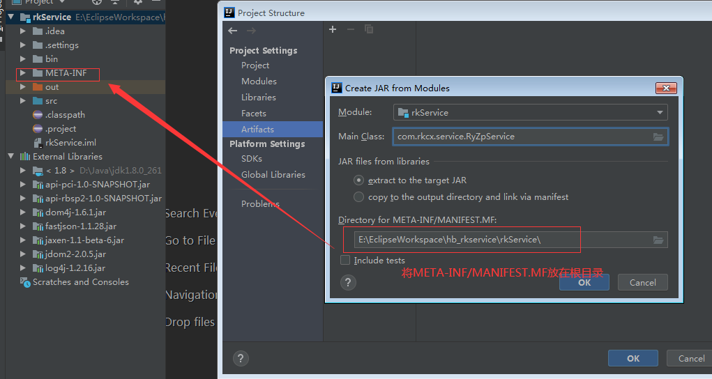 注意:需要将META-INF/MANIFEST.MF放项目根目录,如下图;