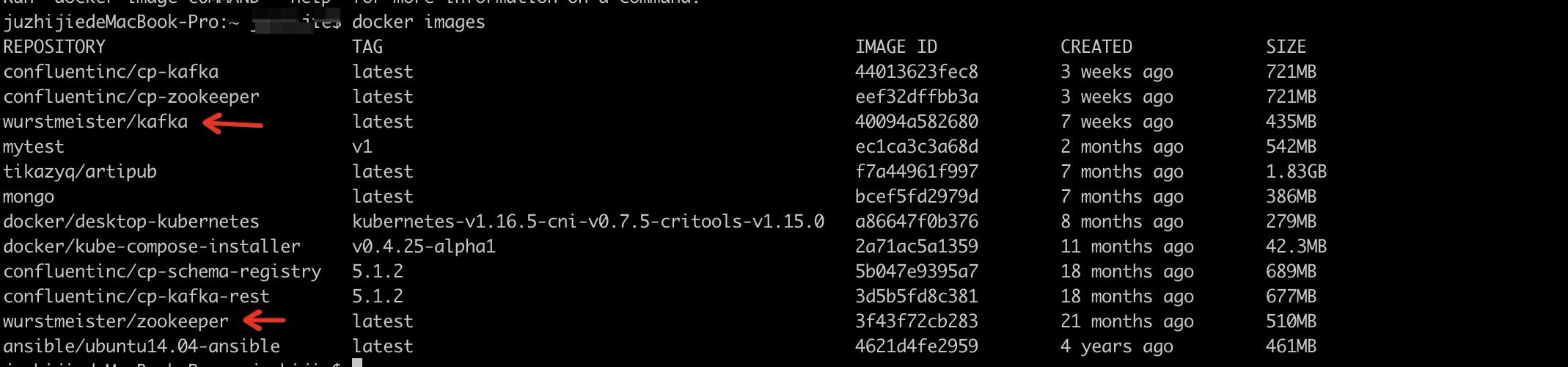 下载完成后使用docker images来验证ZK和Kafka镜像是否下载成功: