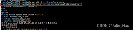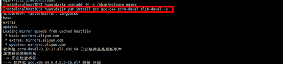 [root@localhostTEST huanjdaj]# yum install gcc gcc-c++ pcre-devel zlib-devel -y