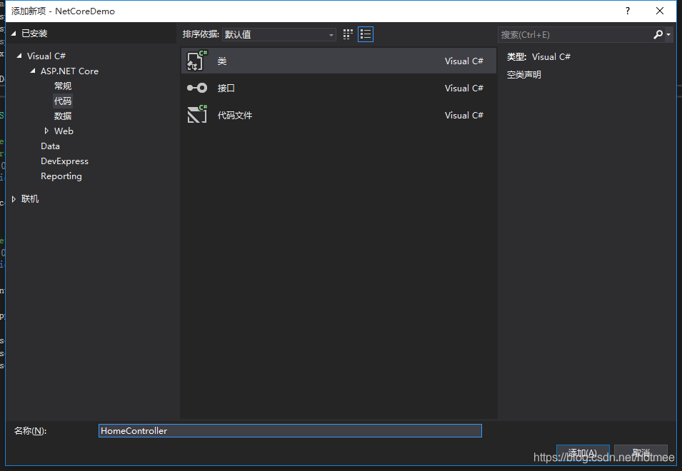 在解决方案中选中NetCoreDemo并添加一个文件夹Controllers,是的他是用来存放控制器的。你也可以换个名字,不过别人看起来将会很糟糕。