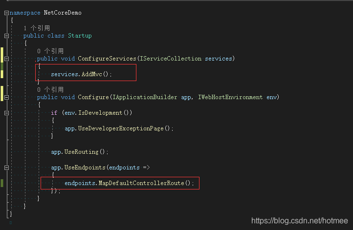 在ConfigureServices 里面添加AddMvc,在Configure里面配置MVC,如图