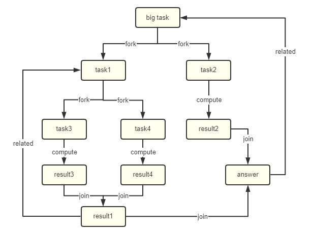 Fork/Join框架主要采用分而治之的理念来处理问题,对于一个比较大的任务,首先将它拆分(fork)为两个小任务task1与task2。