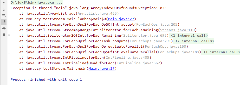 IntStream.rangeClosed(1, 10000).parallel().forEach(i -> list.add(i));执行就立即报错了: