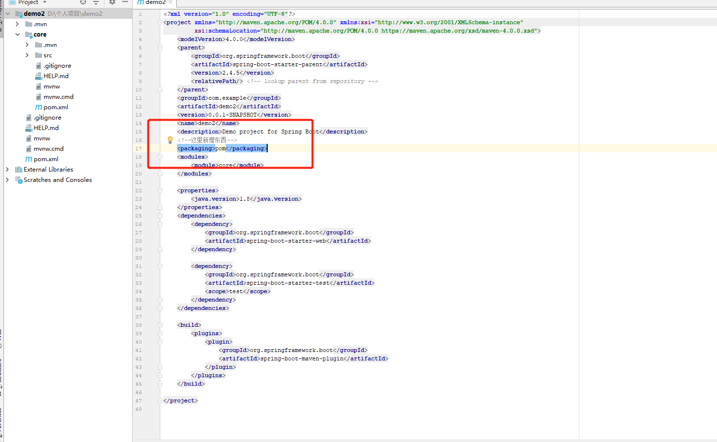 上面是在demo2的pom里面新增packaging和modules将core作为它的模块之一