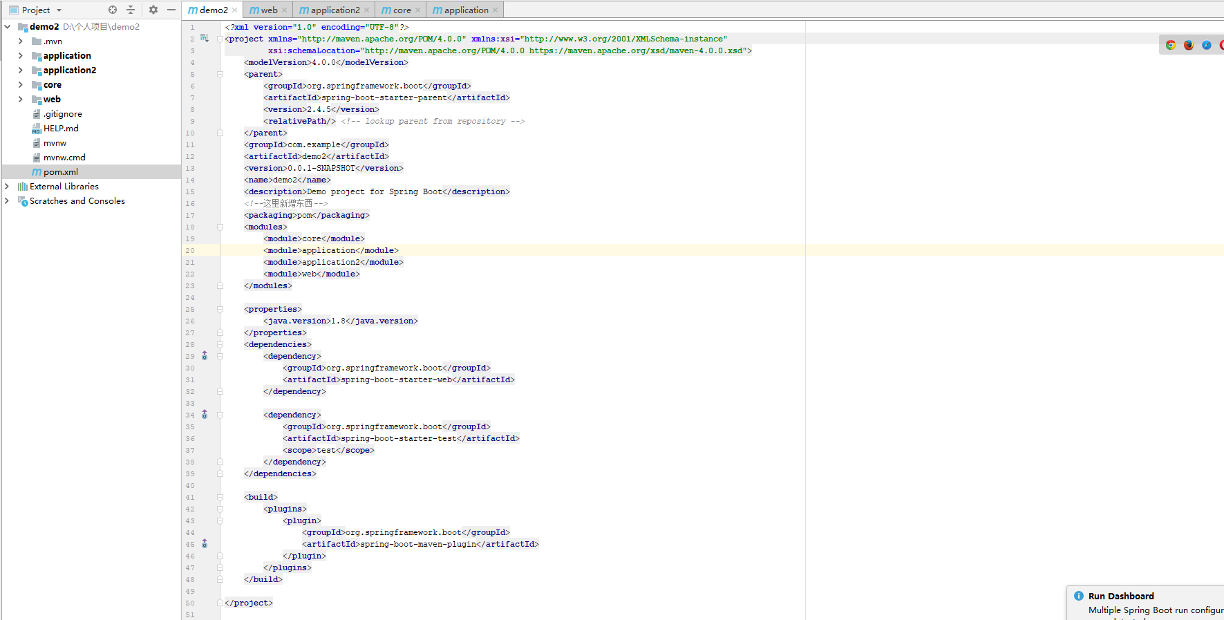 这样我们就多模块搭建好了,我们core,application,application2模块我们不需要启动类,所以我们可以把他们删了,就像这样