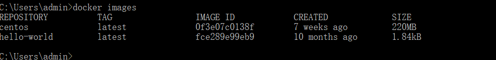 5、继续使用cmd命令行,下载镜像,以centos最新版为例,输入命令docker pull centos:latest,即开始下载。下载完成后使用docker images命令查看下载镜像。