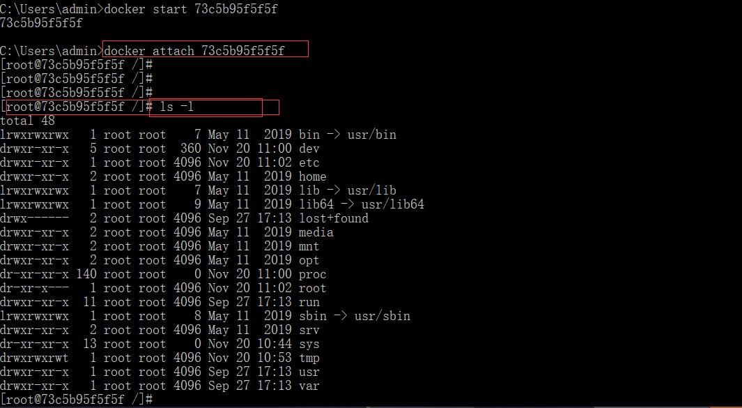 7、下面我们启动容器,docker start 73c5b95f5f5f(容器ID),启动后,我们 尝试能否进入改容器,docker attach 73c5b95f5f5f,此时事可以进入容器的。