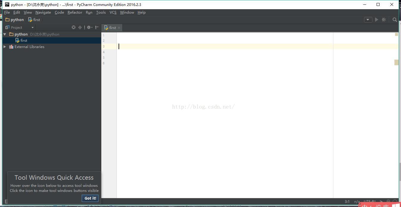 1、单击桌面上的pycharm图标,进入到pycharm中,如下图所示: