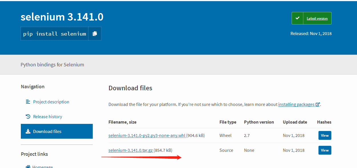 下载安装包(selenium-3.141.0.tar.gz) 版本:3.141.0
